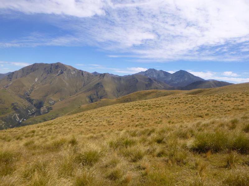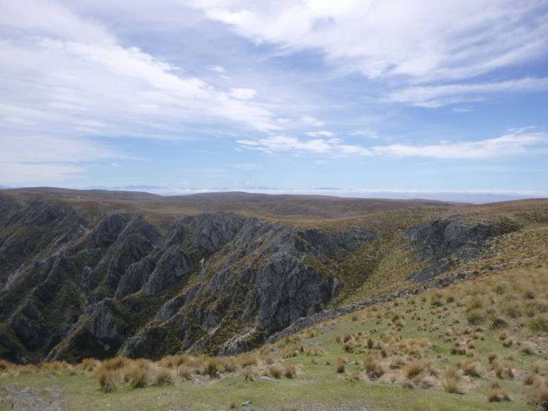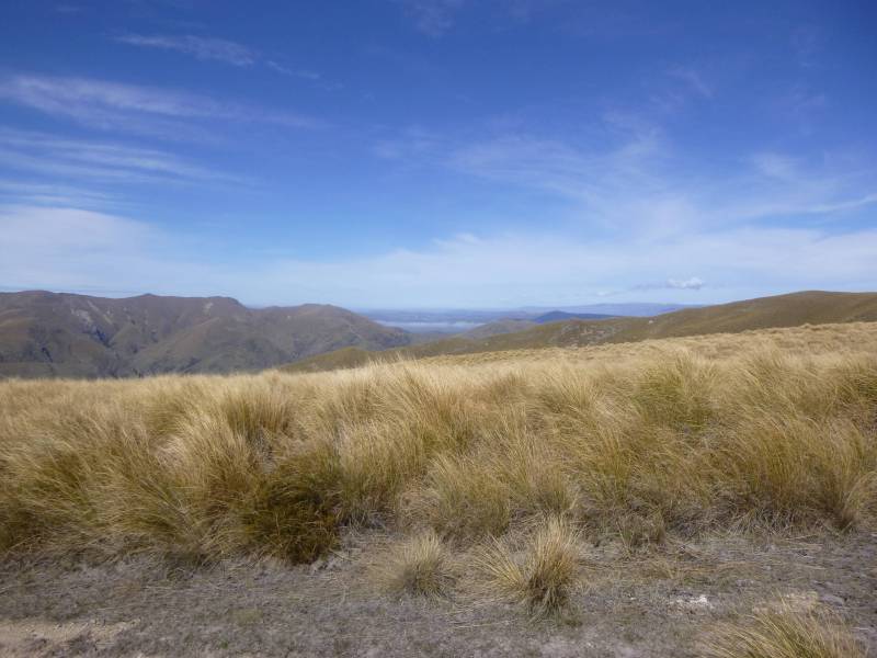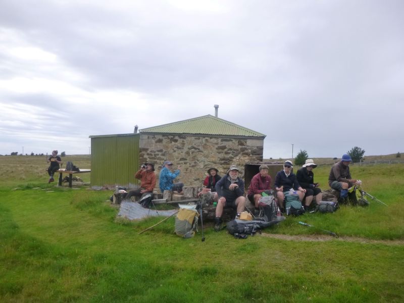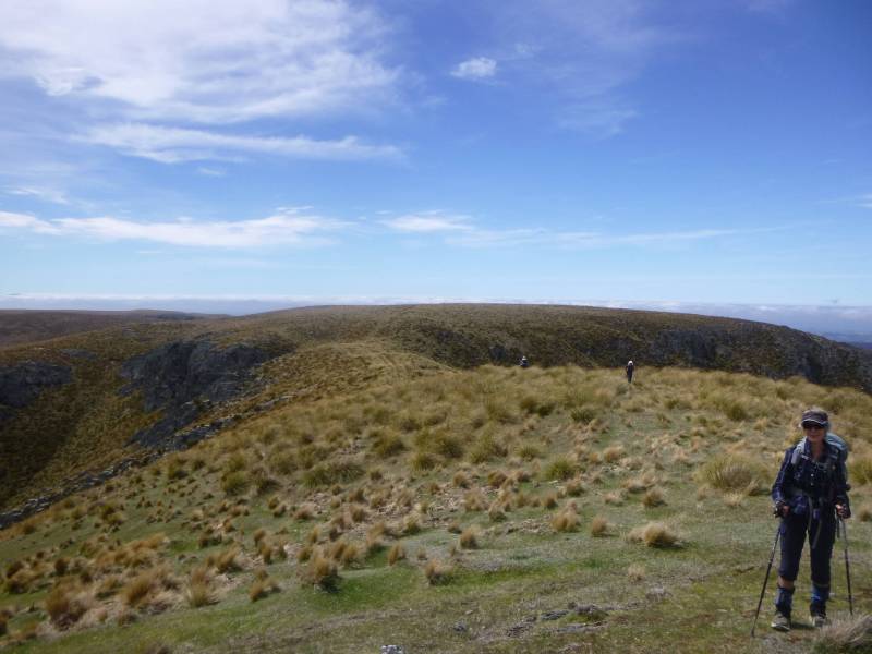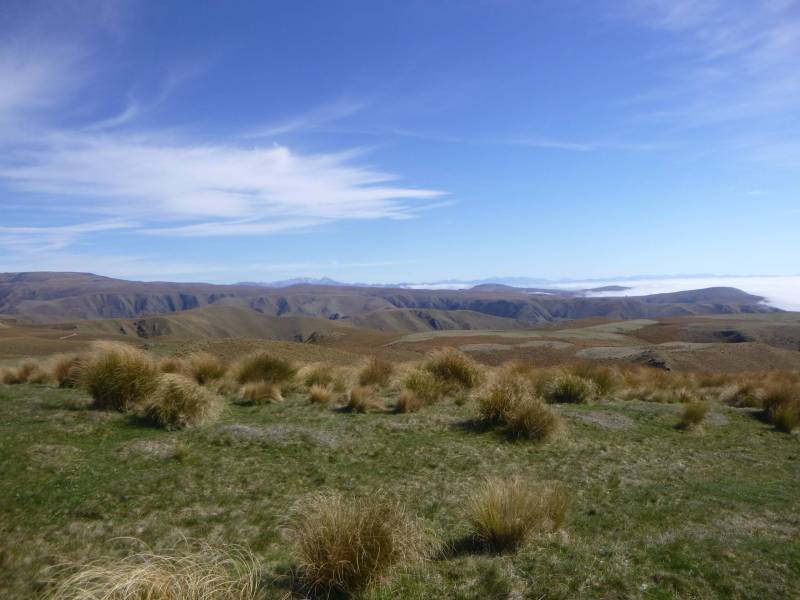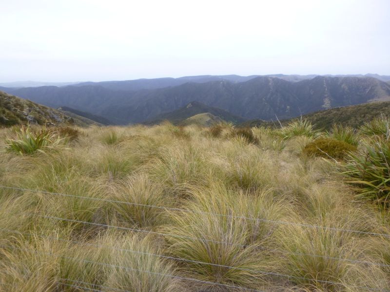 Time was taken to consult maps, compasses and memories before deciding to head down the north side of the hill shortly after 1pm. This took us over less rocky terrain than the ascent, though still requiring care. At one point we struck a barren rock field, which some navigated through and others skirted above. This was followed by a pleasant stroll through tall tussocks. By now the weather was clearing and we could see where we were heading! We then reached a fence with two electric wires which seemed pointless (it seemed to have only one end), but had to be crossed before we could head down the boundary fenceline and across the gully we had traversed in the morning. On the other side, rather than continue up the fence, we headed left on a grassy track which sidled up with fewer obstacles. Shortly we were on a well-formed track which took us back at the gate at around 2.30pm.