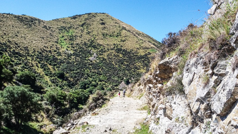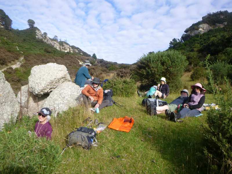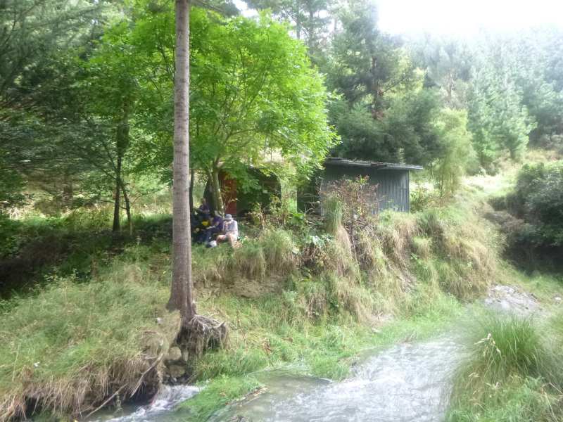 Lunch was at 12.45pm on another grassy area, but this time with good rocks to sit on and the river just below us. The sound of the water and the warmth of the day lulled some into a light sleep until being informed that it was time to move on, the South Temple hut supposedly being not too far around the corner—–.